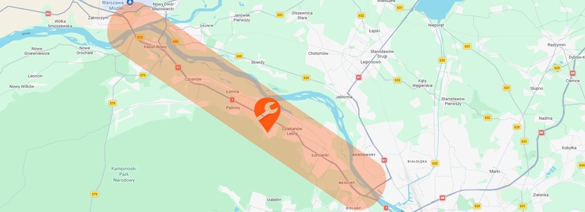 Działam głównie na zaznaczonym obszarze. Dzięki temu mogę szybko zareagować i przyjechać do awarii auta nawet w 30 minut.